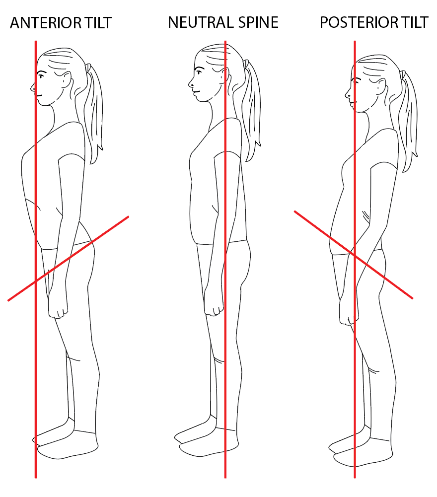 When you’re standing, pay attention to your posture. Are you pushing your hips forward? Arching your back? You want to work towards a neutral spine alignment shown in the image below.